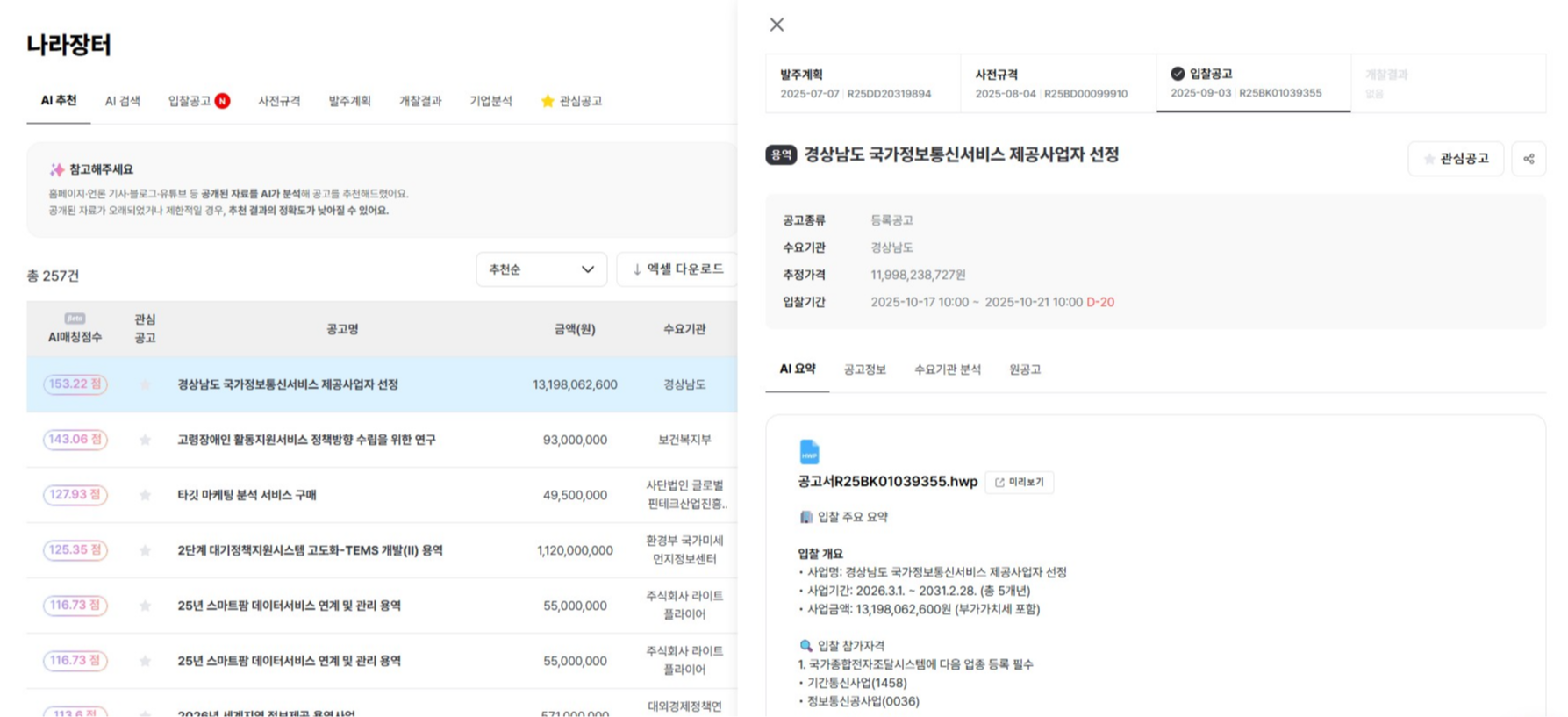 AI 검색으로 관련 키워드를 입력하면 공공입찰 공고를 쉽게 파악할 수 있거든요.